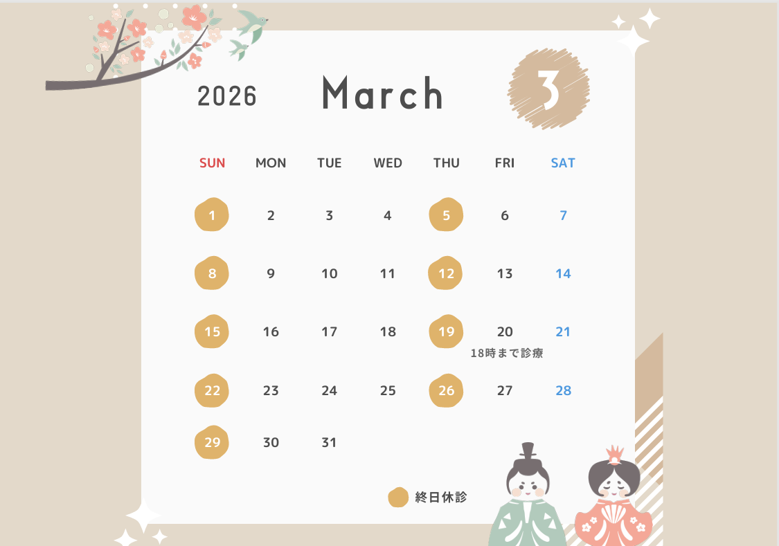 ⇒前日の3月19日(木)は終日休診とさせていただきます。